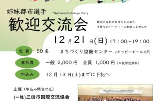 詳細を見る第37回三田国際マスターズマラソン三田市姉妹都市選手歓迎交流会を行います。歓迎と友好の気持ちを込めた手作りのパーティです。心ばかりのお料理をご用意しておりますので、皆さん、どうぞご…