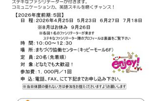 詳細を見る英語で自由にお話しできる「チャットの会」、1回1,000円(当日払い)でお手軽に英会話を楽しんでいただけます。「英語で話したいのに機会がない!」という方はぜひご参加ください。 …