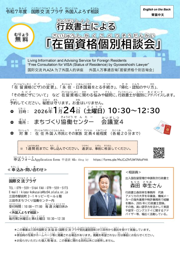 【募集】国際交流プラザ:外国人よろず相談「在留資格個別相談会」/Free Consultation for VISA (Status of Residence)/居留资格个别咨询会